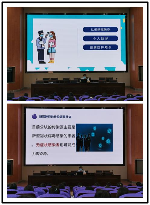 首先由校医务室罗兰香医生向同学们讲解了新冠肺炎的相关知识以及个人防护注意事项。罗医生要求同学们:勤洗手、多通风,强身健体很重要,口罩佩戴讲方法,良好习惯要养成,疫情防控不放松。