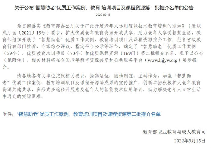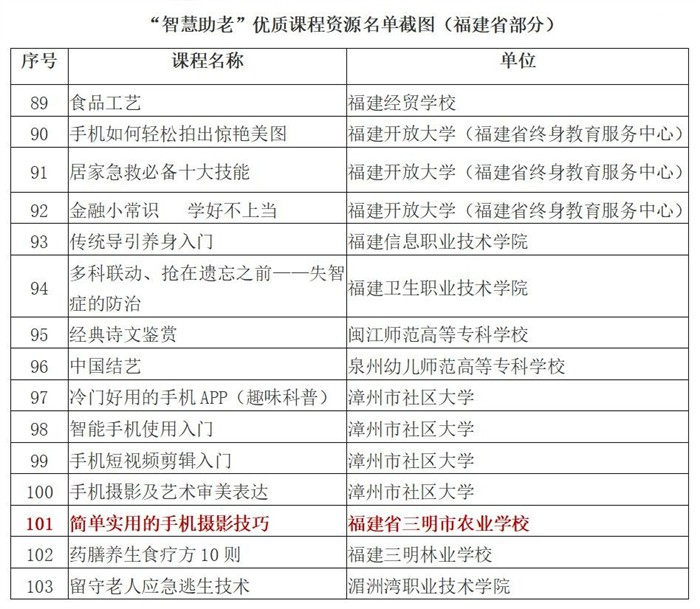 我校选送的《简单实用的手机摄影技巧》作为优质课程资源于2022年6月份入选第二批省级“智慧助老”专题项目推介名单(全省入选的课程资源共51门)。近日,根据教育部职业教育与成人教育司发布的《关于公布“智慧助老”优质工作案例、教育培训项目及课程资源第二批推介名单的公告》,共确定优质课程资源169门,我校选送的《简单实用的手机摄影技巧》成功入选(福建省共入选15门)。