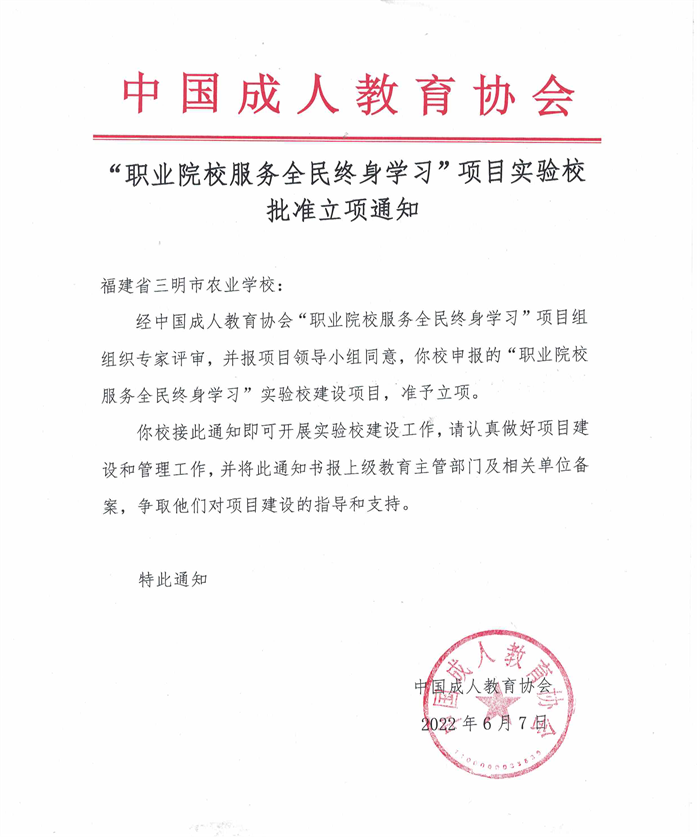根据中国成人教育协会发出的《关于服务“职业院校参与全民终身学习”的通知》(中成协〔2022〕012号),经学校组织申报,顺利入选“职业院校服务全民终身学习”项目第一批实验校,并于2022年7月参加了在昆明举办的工作推进会。