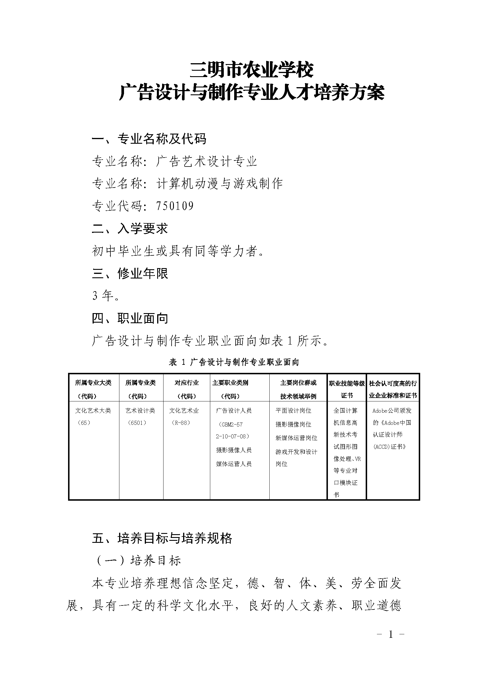 三明市农业学校广告艺术设计专业人才培养方案(2023)