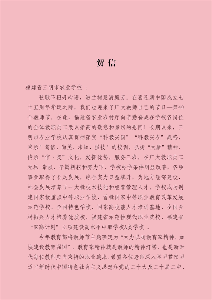 2024年9月10日,在第40个教师节,福建省农业农村厅发来贺信,向我校全体教职员工致以节日的祝贺与亲切的慰问。