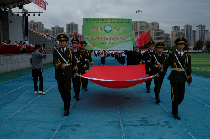 秋风满盈,天高云阔。2024年10月29日上午,三明市农业学校在学校体育运动场隆重举行第三十七届体育运动会暨科技艺术节开幕式。学校体育运动会暨科技艺术节组委会主任、党委书记、校长罗世钦,组委会副主任、党委委员谢阳军、江文林、陈文优、胡安生,三明农校法治副校长─三明市公安局沙县分局一级警长 张诗汉及组委会其他委员等出席开幕式。开幕式由校体育运动会暨科技艺术节组委会副主任、总裁判长、党委委员、副校长胡安生主持。本届运动会共有95个代表队、1184名运动员参与12个项目的竞赛。